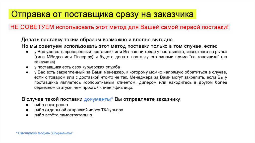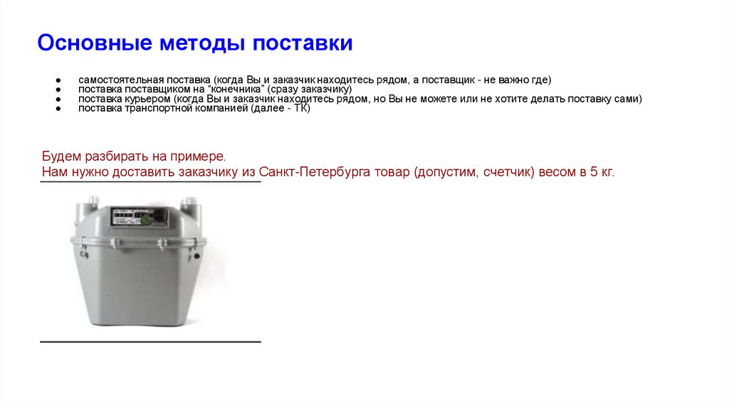 Основные методы поставкисамостоятельная поставка (когда Вы и заказчик находитесь рядом, а поставщик - не важно где)