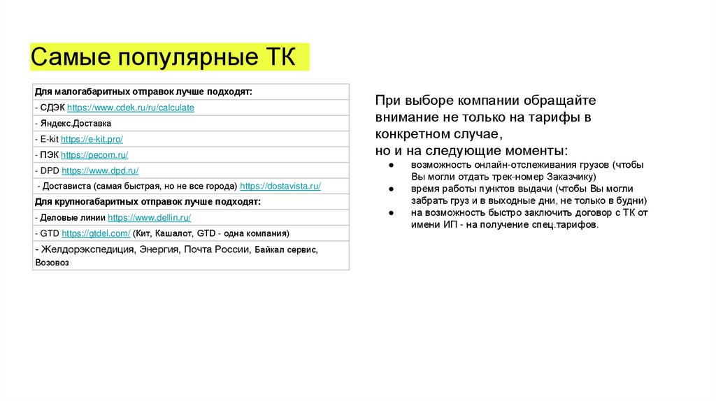 Самые популярные ТКДля малогабаритных отправок лучше подходят: