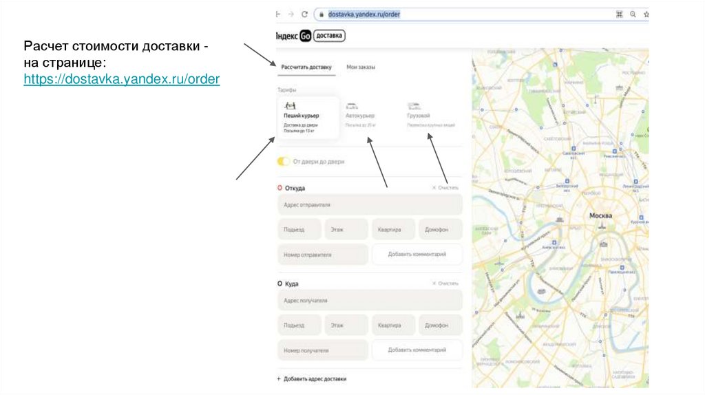 Расчет стоимости доставки на странице:https://dostavka.yandex.ru/order