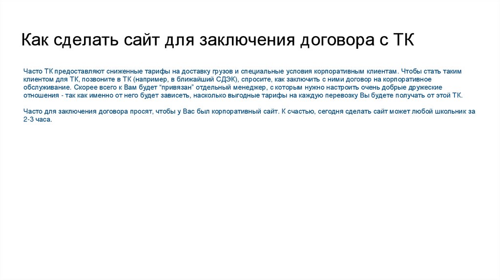Как сделать сайт для заключения договора с ТКЧасто ТК предоставляют сниженные тарифы на доставку грузов и специальные условия корпоративным клиентам. Чтобы стать таким