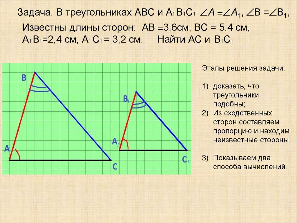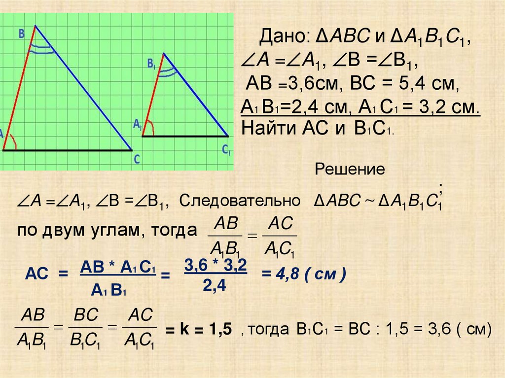Задача. В треугольниках АВС и А1 В1С1 A = A1, В = В1,Известны длины сторон: АВ =3,6см, ВС = 5,4 см,