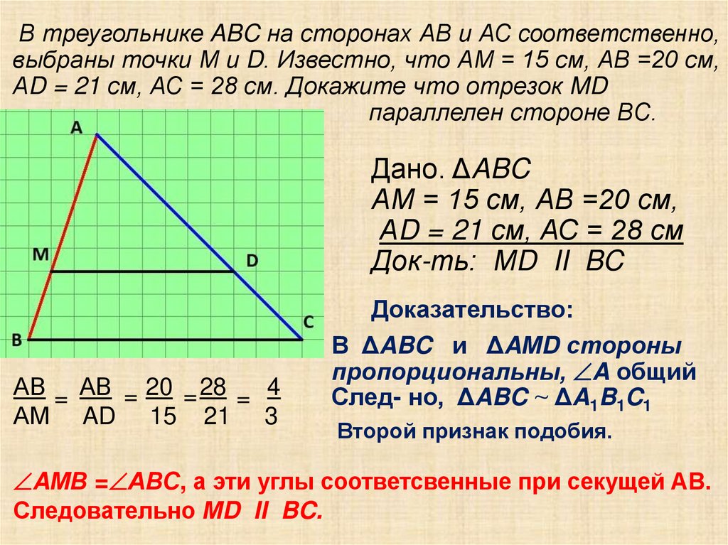 В треугольнике ABC на сторонах АВ и АС соответственно,выбраны точки М и D. Известно, что АМ = 15 см, АВ =20 см,