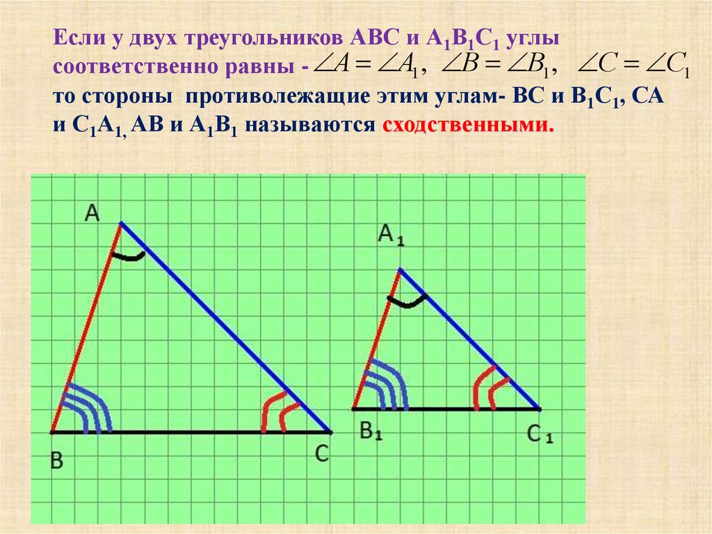Если у двух треугольников АВС и А1В1С1 углысоответственно равны - А А1 , В В1 , С С1