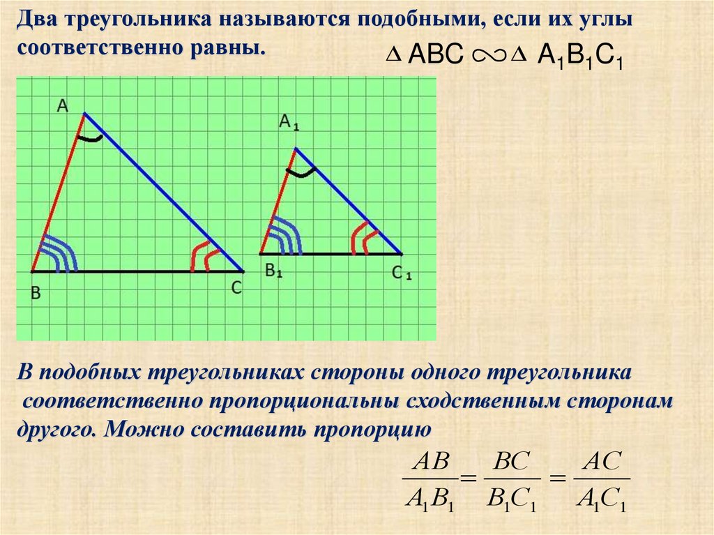Два треугольника называются подобными, если их углысоответственно равны.