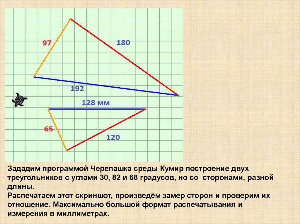 Зададим программой Черепашка среды Кумир построение двухтреугольников с углами 30, 82 и 68 градусов, но со сторонами, разной