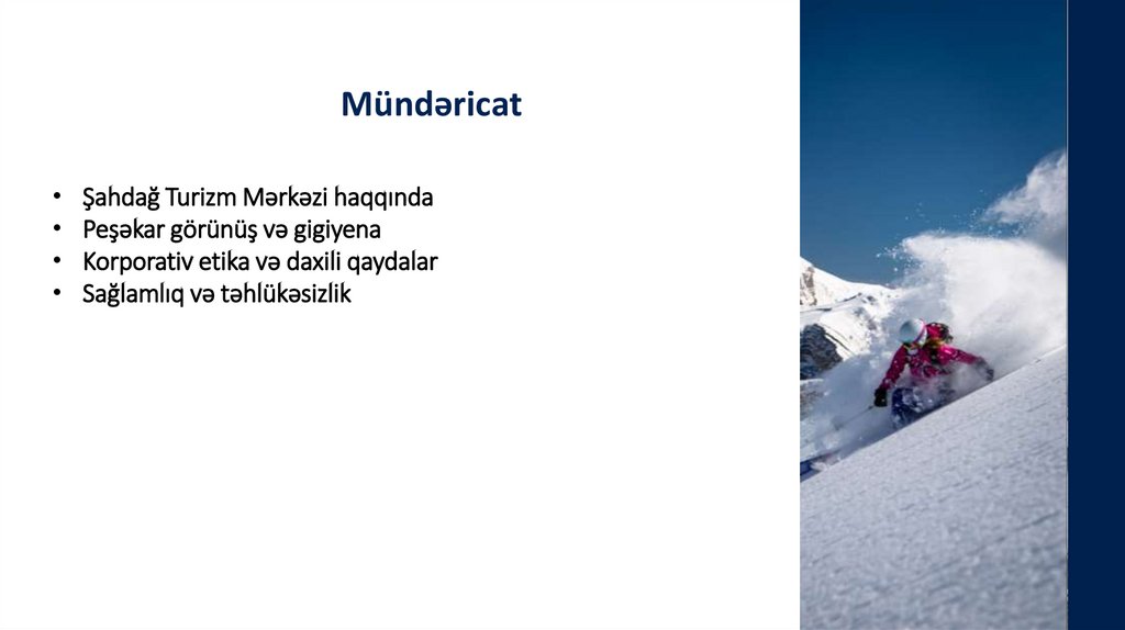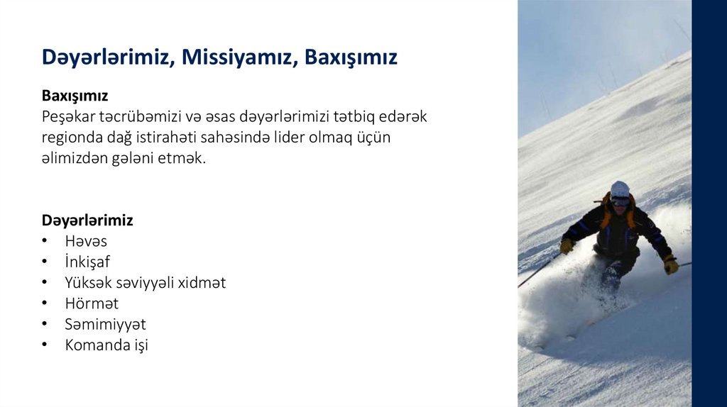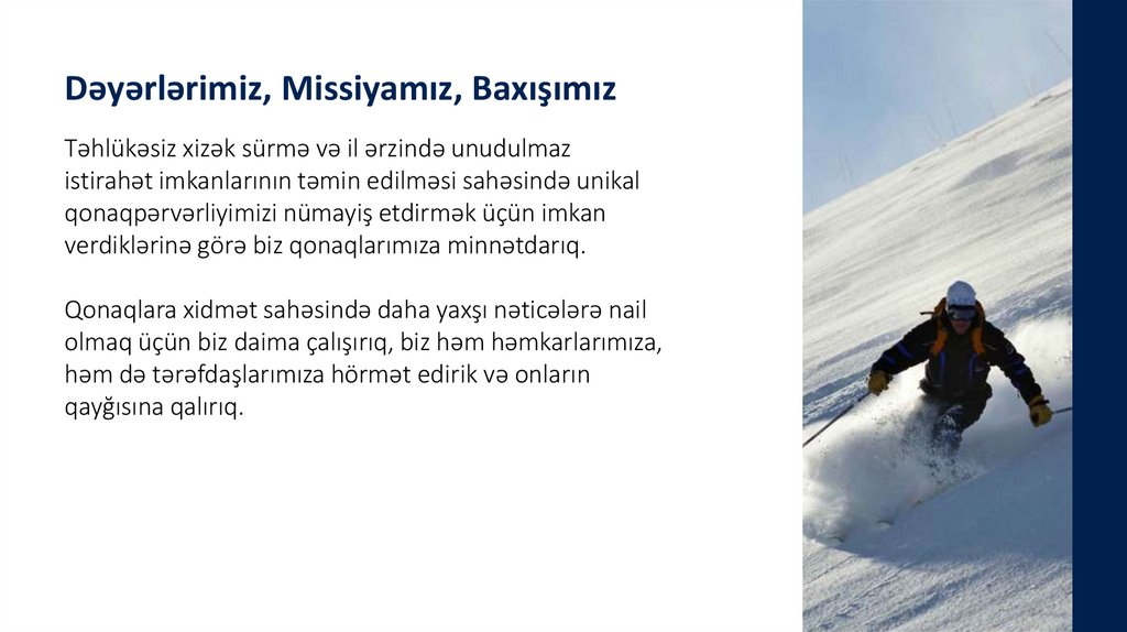 Dəyərlərimiz, Missiyamız, BaxışımızTəhlükəsiz xizək sürmə və il ərzində unudulmaz