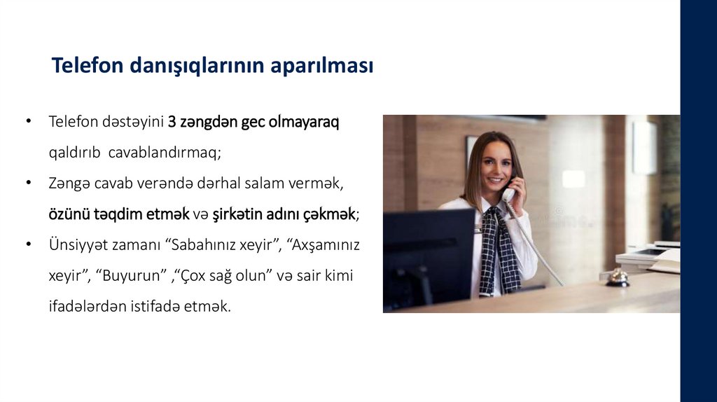 Telefon danışıqlarının aparılması• Telefon dəstəyini 3 zəngdən gec olmayaraq