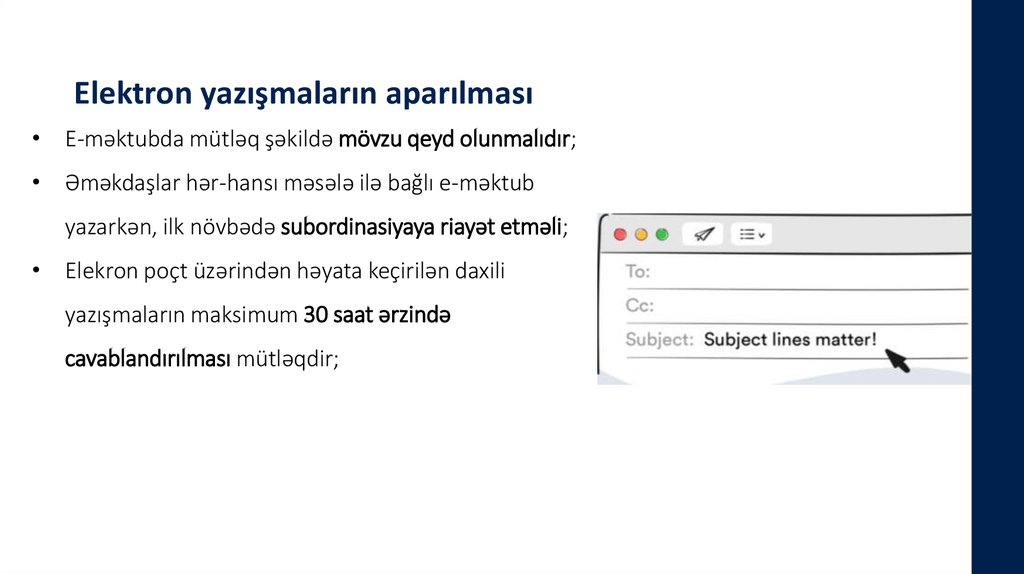 Elektron yazışmaların aparılması• E-məktubda mütləq şəkildə mövzu qeyd olunmalıdır;