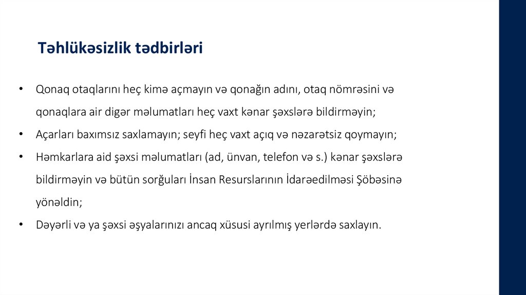 Təhlükəsizlik tədbirləri• Qonaq otaqlarını heç kimə açmayın və qonağın adını, otaq nömrəsini və