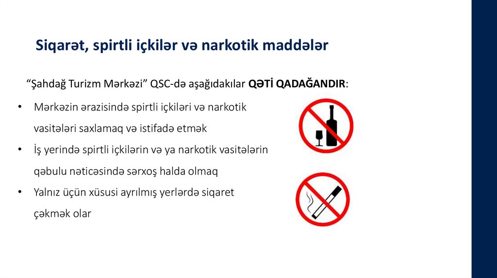 Siqarət, spirtli içkilər və narkotik maddələr“Şahdağ Turizm Mərkəzi” QSC-də aşağıdakılar QƏTİ QADAĞANDIR: