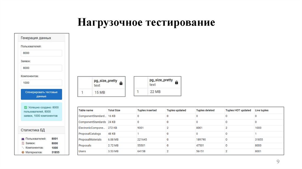компонентов системы. Выполнено нагрузочное тестирование с генерацией