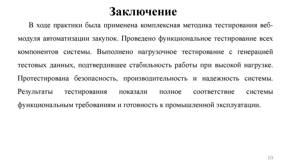 ЗаключениеВ ходе практики была применена комплексная методика тестирования вебмодуля автоматизации закупок. Проведено функциональное тестирование всех