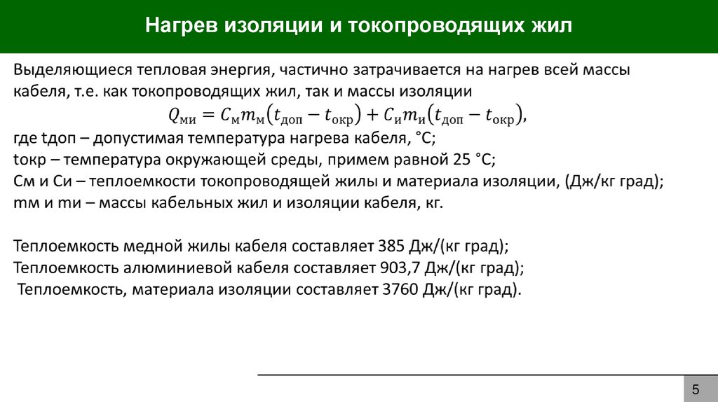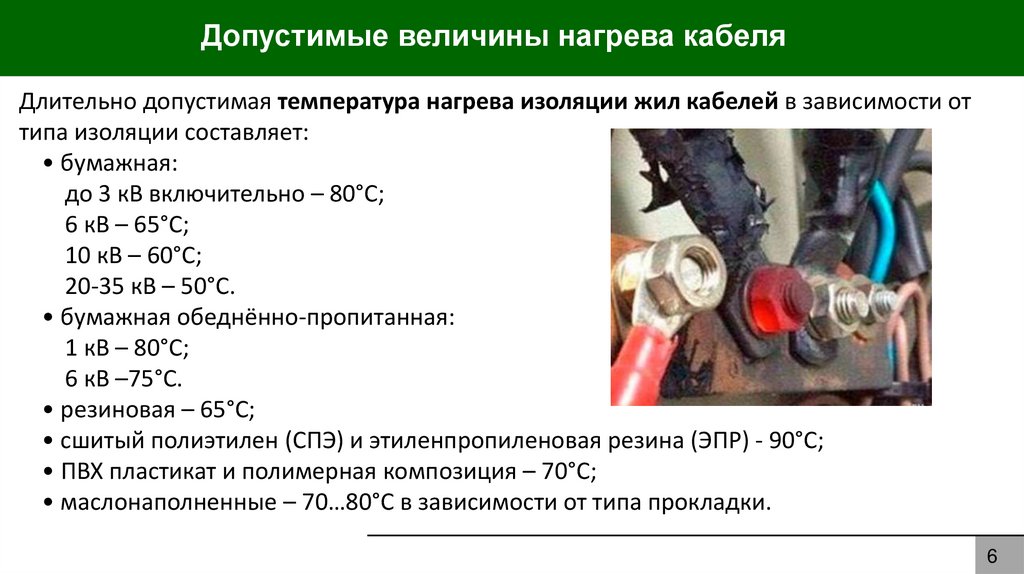 Допустимые величины нагрева кабеляДлительно допустимая температура нагрева изоляции жил кабелей в зависимости от