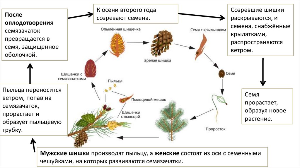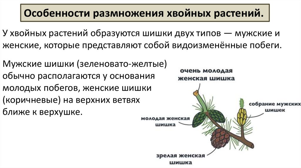Особенности размножения хвойных растений.У хвойных растений образуются шишки двух типов — мужские и