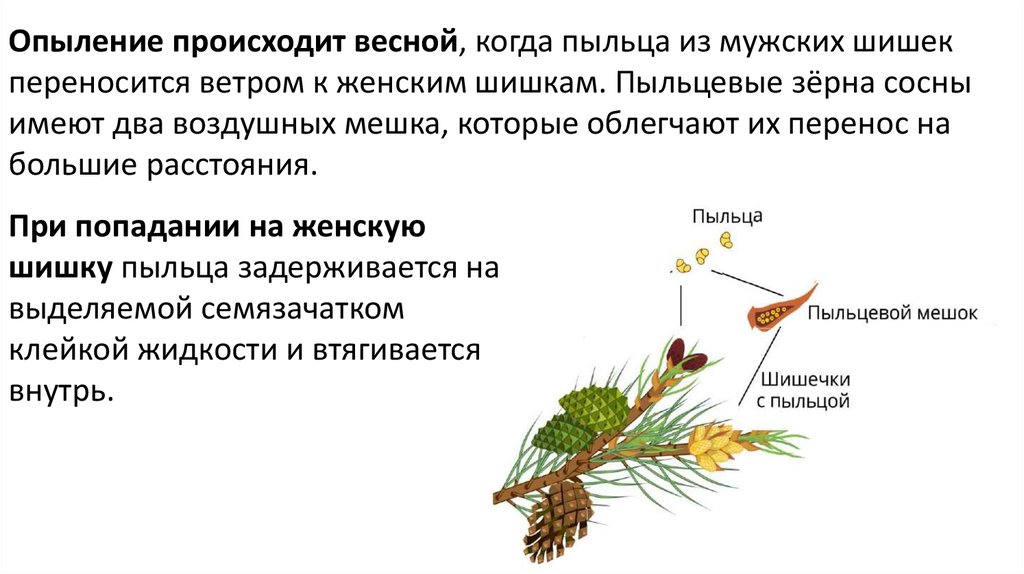 Опыление происходит весной, когда пыльца из мужских шишекпереносится ветром к женским шишкам. Пыльцевые зёрна сосны