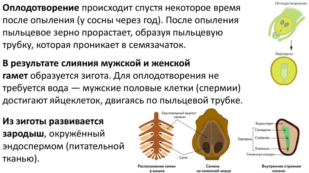 Оплодотворение происходит спустя некоторое времяпосле опыления (у сосны через год). После опыления
