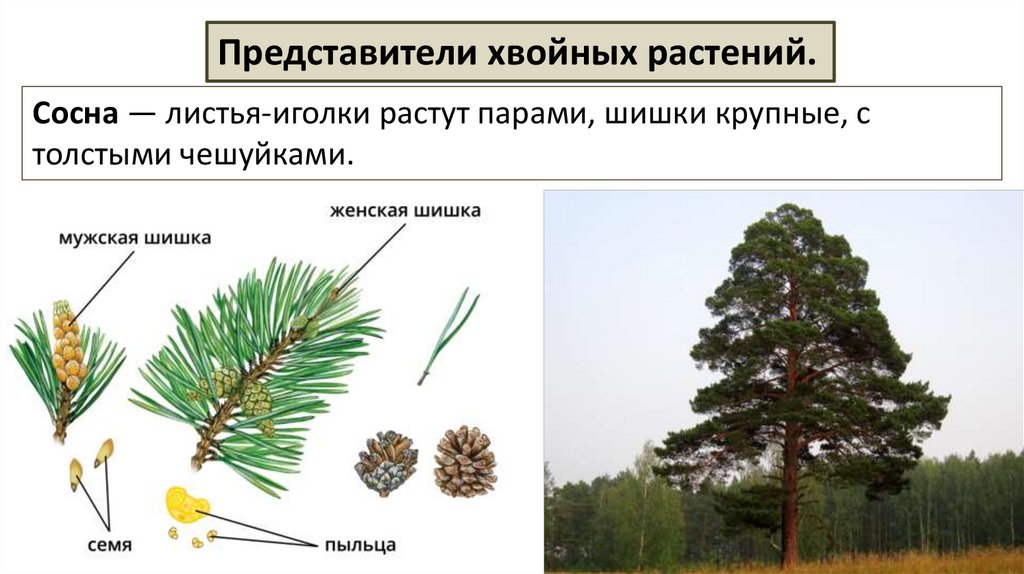 Представители хвойных растений.Сосна — листья-иголки растут парами, шишки крупные, с