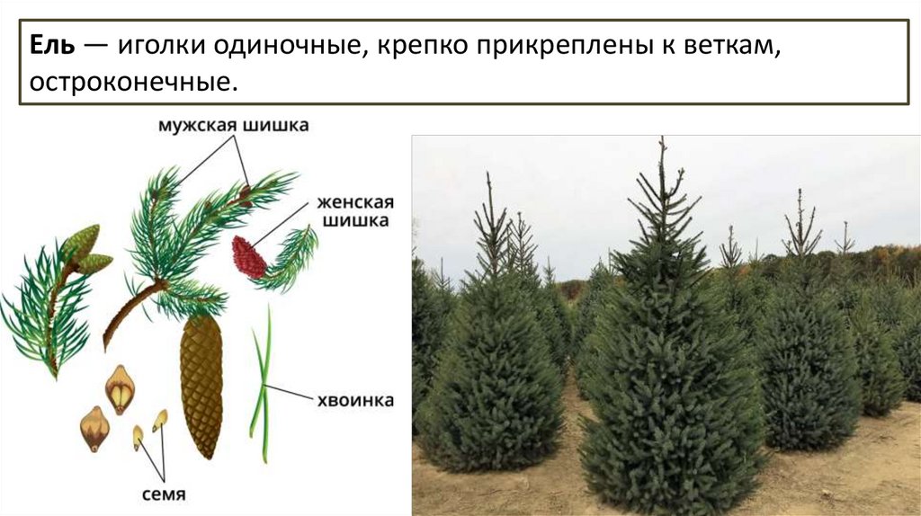 Ель — иголки одиночные, крепко прикреплены к веткам,остроконечные.