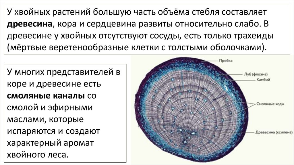 У хвойных растений большую часть объёма стебля составляетдревесина, кора и сердцевина развиты относительно слабо. В