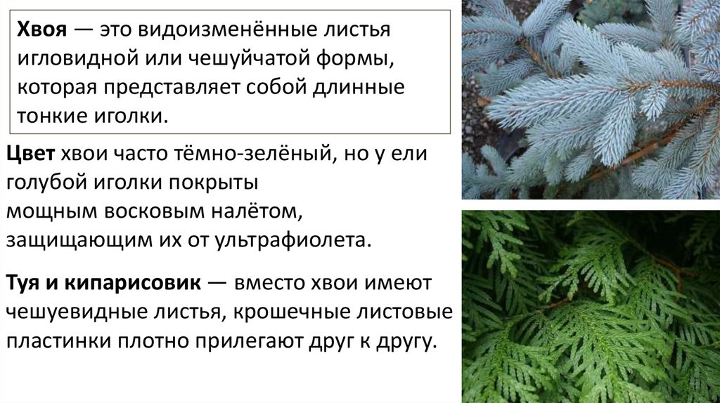 Хвоя — это видоизменённые листьяигловидной или чешуйчатой формы,