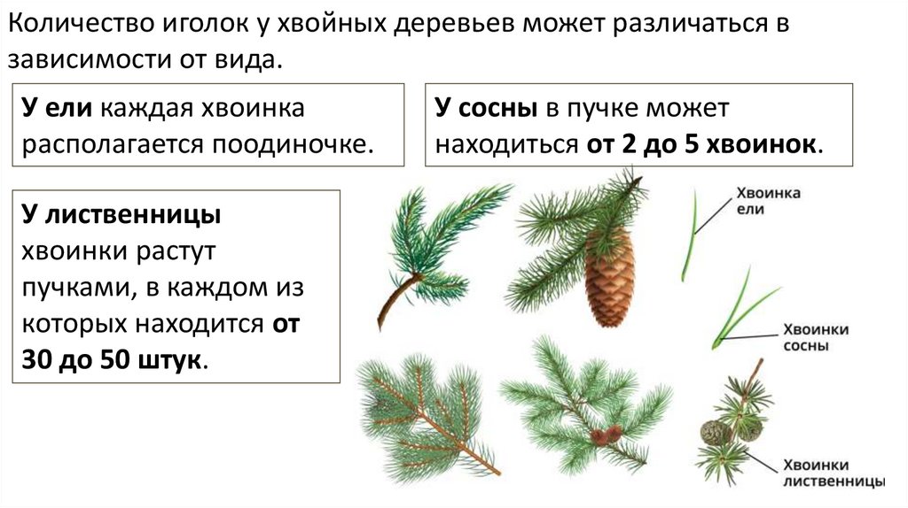 Количество иголок у хвойных деревьев может различаться взависимости от вида.