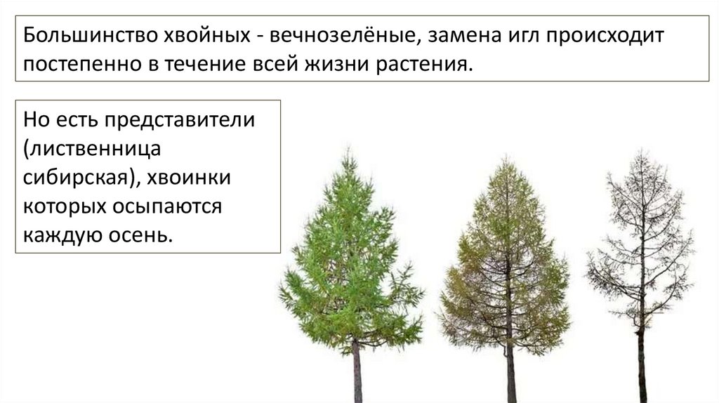 Большинство хвойных - вечнозелёные, замена игл происходитпостепенно в течение всей жизни растения.