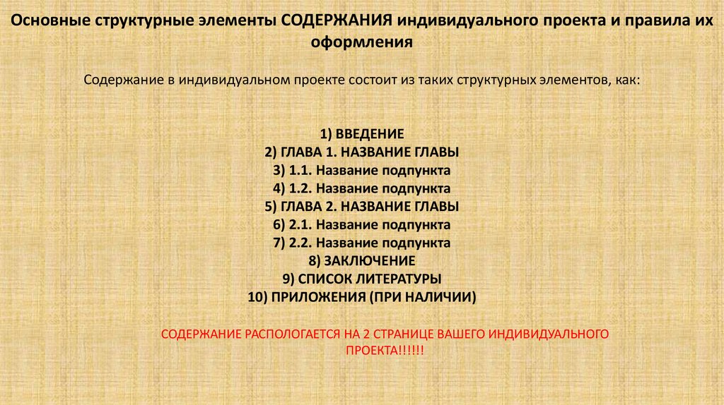 Основные структурные элементы СОДЕРЖАНИЯ индивидуального проекта и правила ихоформления