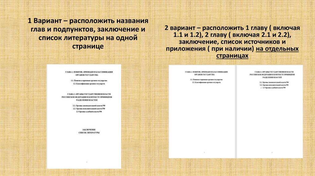 1 Вариант – расположить названияглав и подпунктов, заключение и