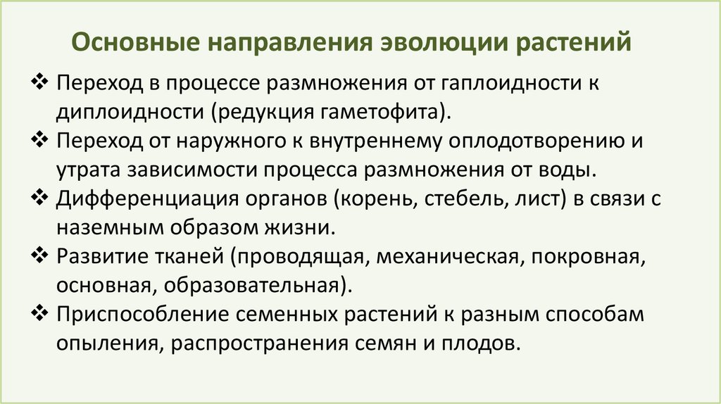Основные направления эволюции растенийПереход в процессе размножения от гаплоидности к