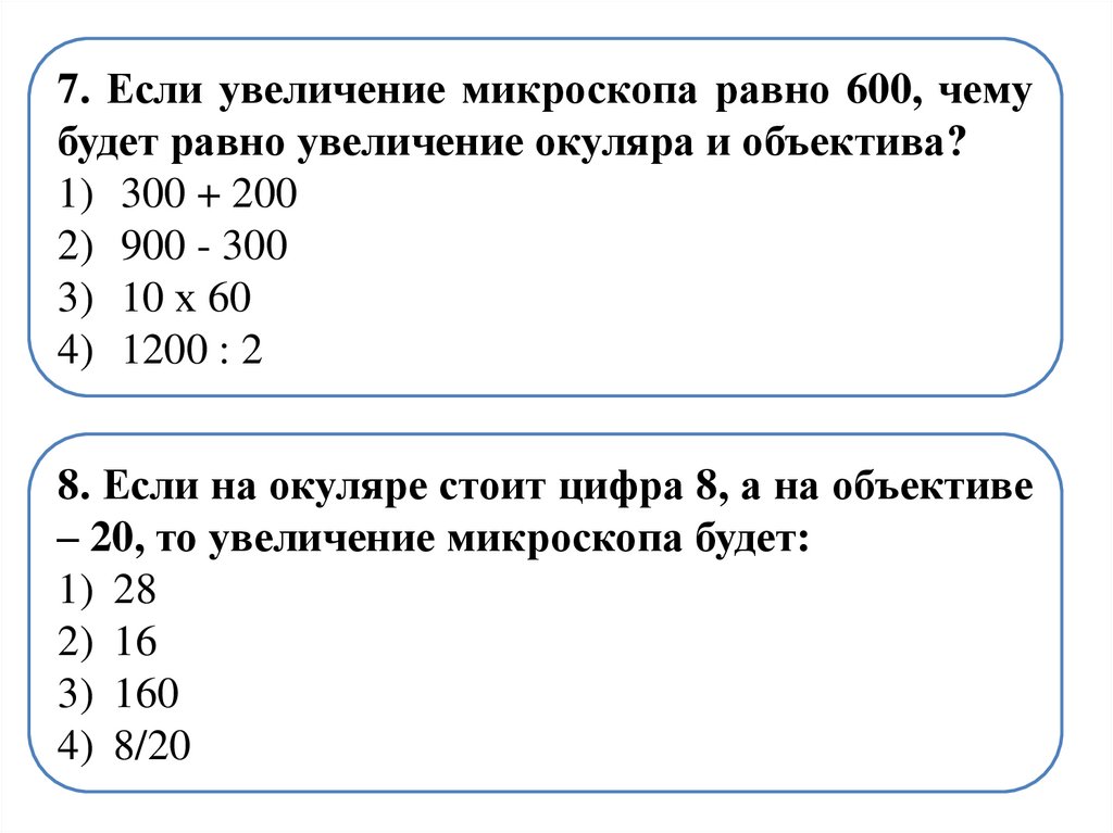 7. Если увеличение микроскопа равно 600, чемубудет равно увеличение окуляра и объектива?