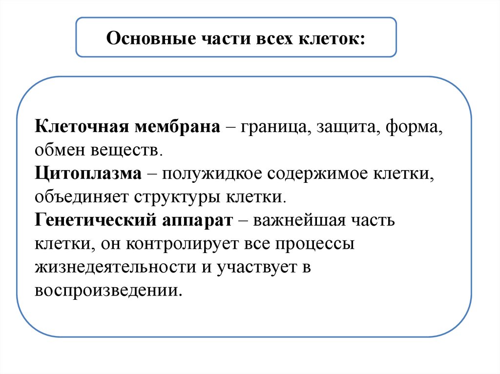 Основные части всех клеток:Клеточная мембрана – граница, защита, форма,