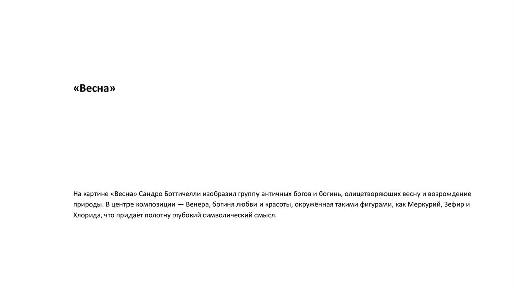 «Весна»На картине «Весна» Сандро Боттичелли изобразил группу античных богов и богинь, олицетворяющих весну и возрождение