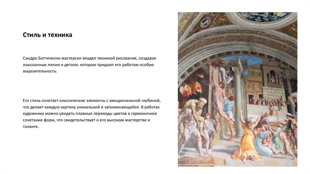 Стиль и техникаСандро Боттичелли мастерски владел техникой рисования, создавая