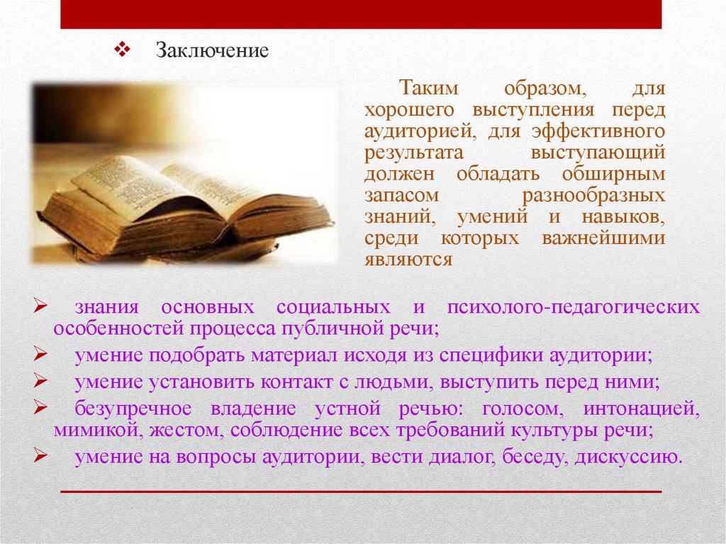 умение на вопросы аудитории, вести диалог, беседу, дискуссию.