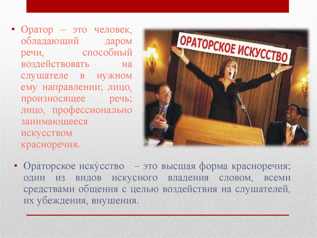 • Ора́торское иску́сство – это высшая форма красноречия;
