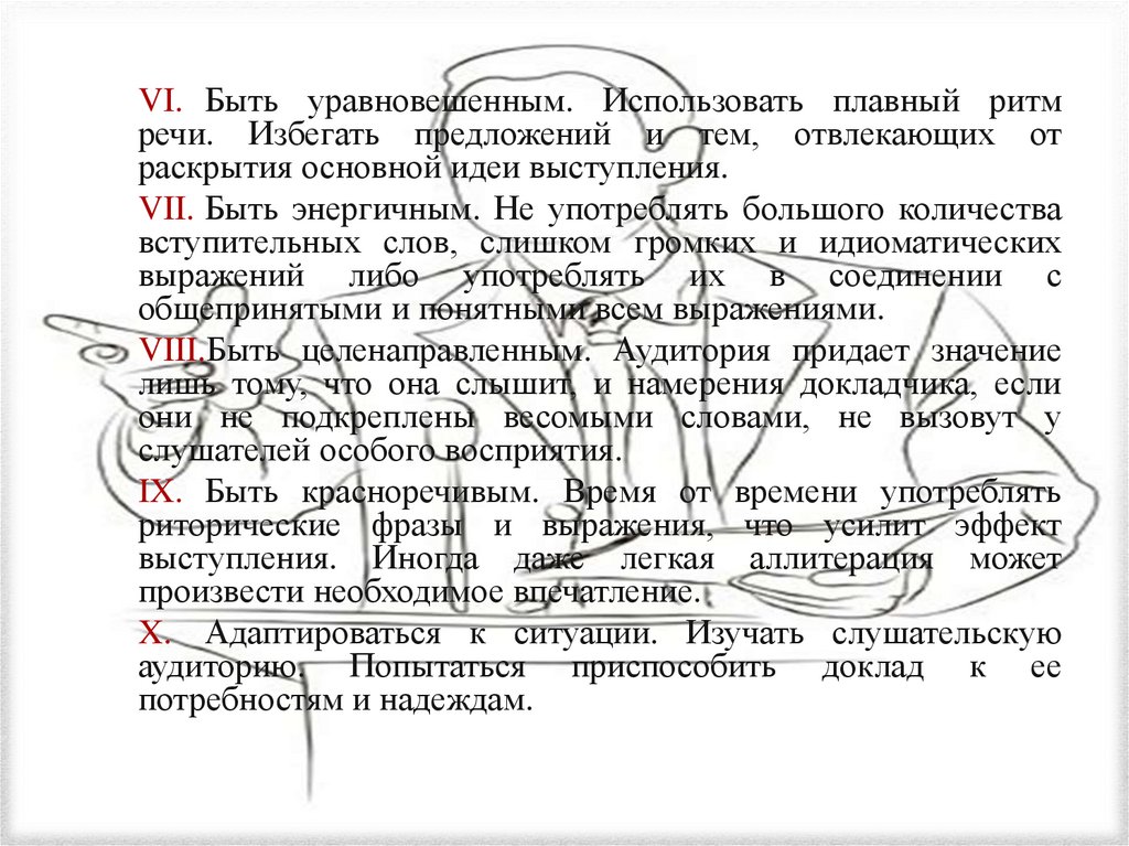 VI. Быть уравновешенным. Использовать плавный ритмречи. Избегать предложений и тем, отвлекающих от