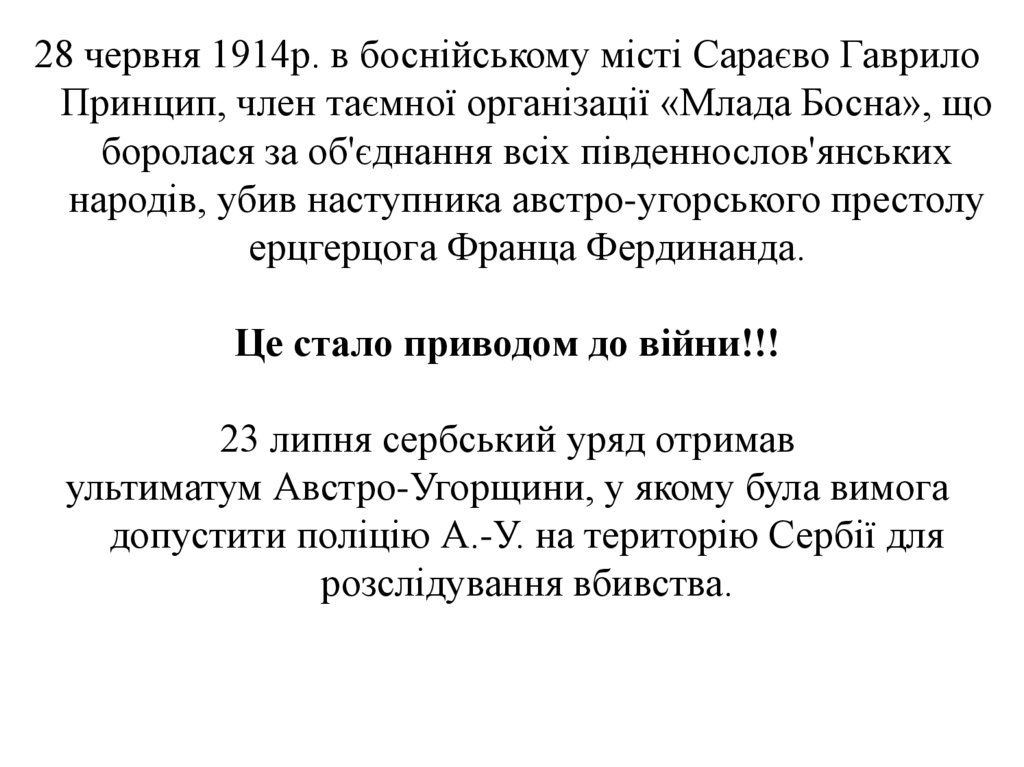28 червня 1914р. в боснійському місті Сараєво ГаврилоПринцип, член таємної організації «Млада Босна», що