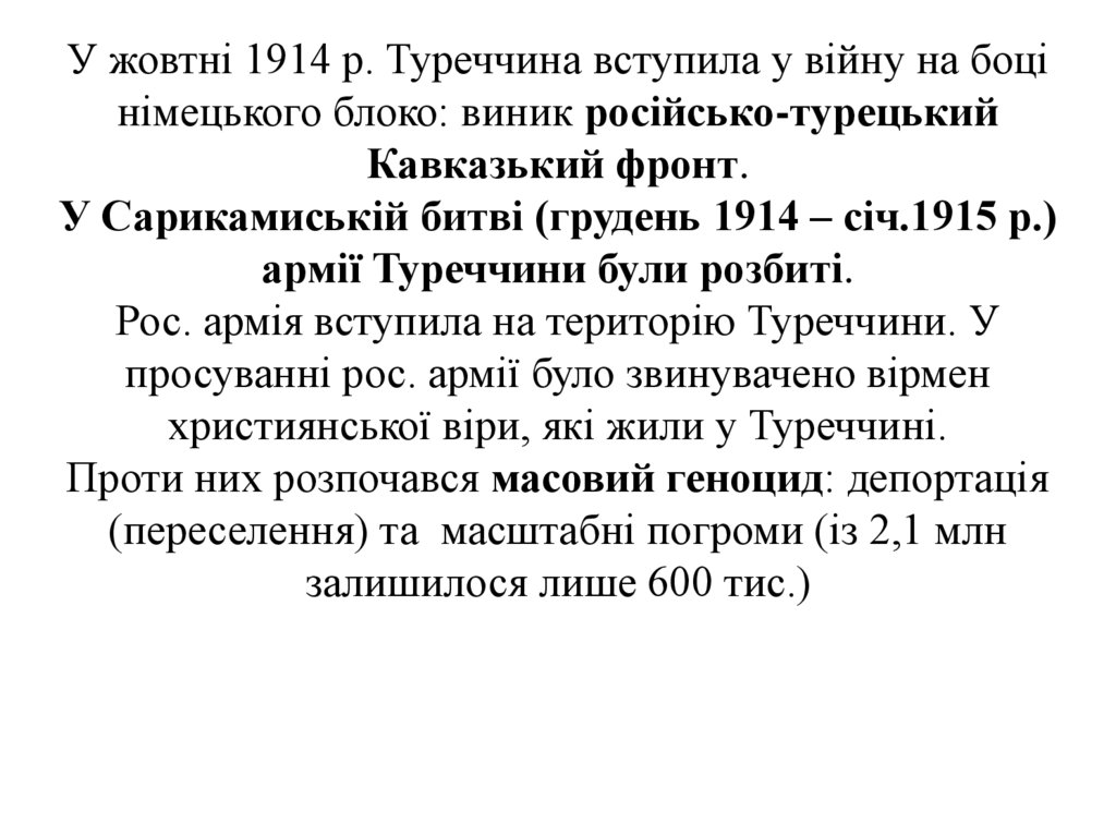 У жовтні 1914 р. Туреччина вступила у війну на боцінімецького блоко: виник російсько-турецький