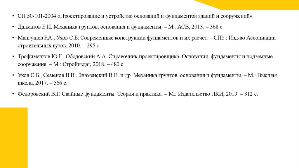 • СП 50-101-2004 «Проектирование и устройство оснований и фундаментов зданий и сооружений».• Далматов Б.И. Механика грунтов, основания и фундаменты. – М.: АСВ, 2013. – 368 с.