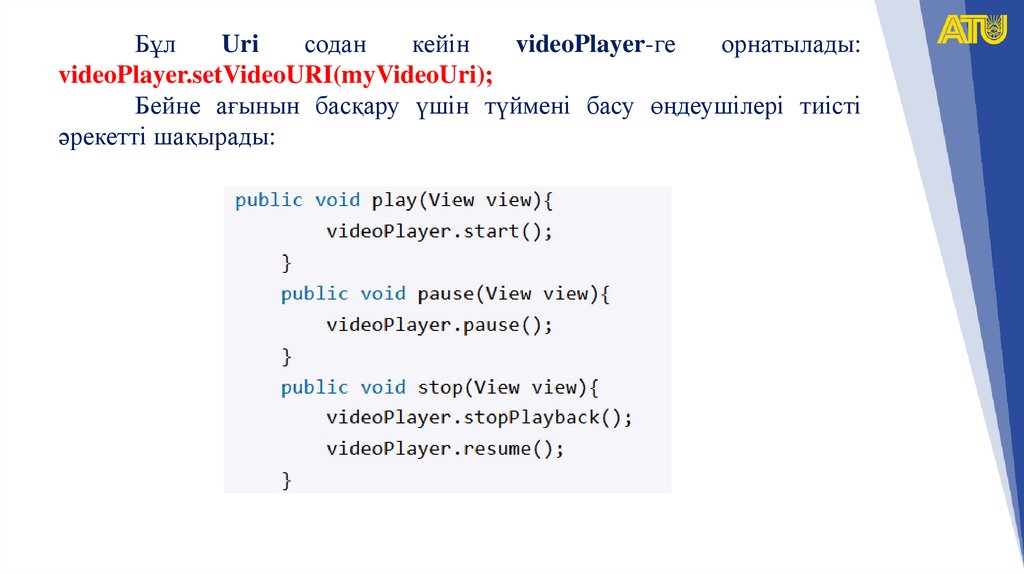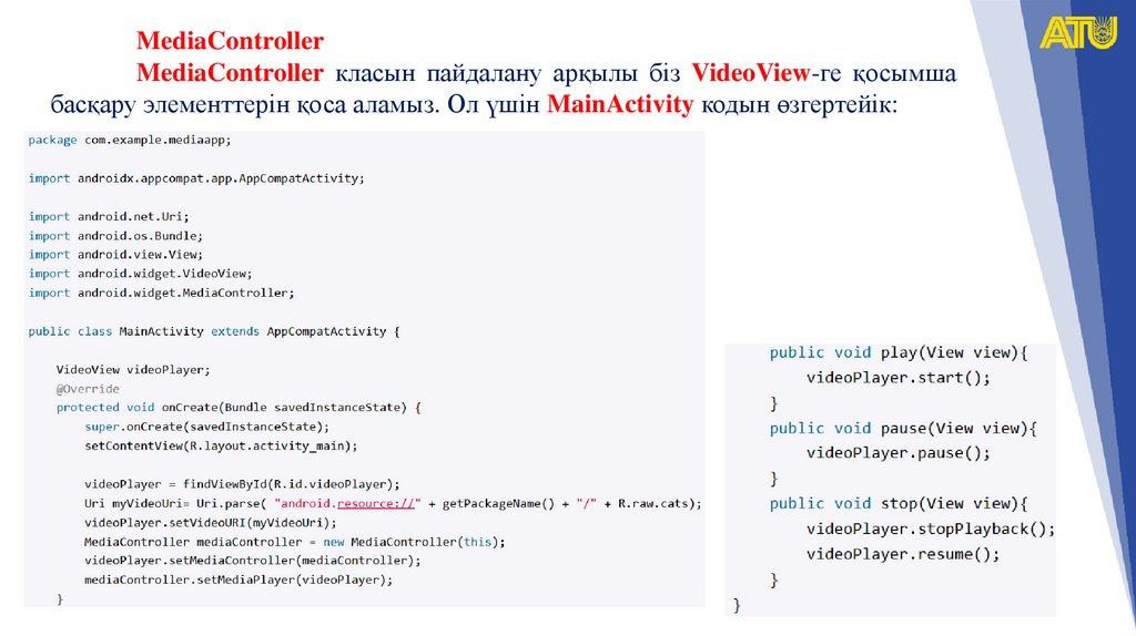 MediaControllerMediaController класын пайдалану арқылы біз VideoView-ге қосымша