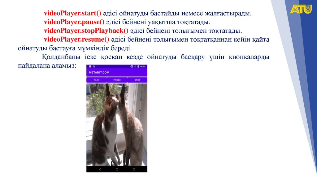 videoPlayer.start() әдісі ойнатуды бастайды немесе жалғастырады.videoPlayer.pause() әдісі бейнені уақытша тоқтатады.