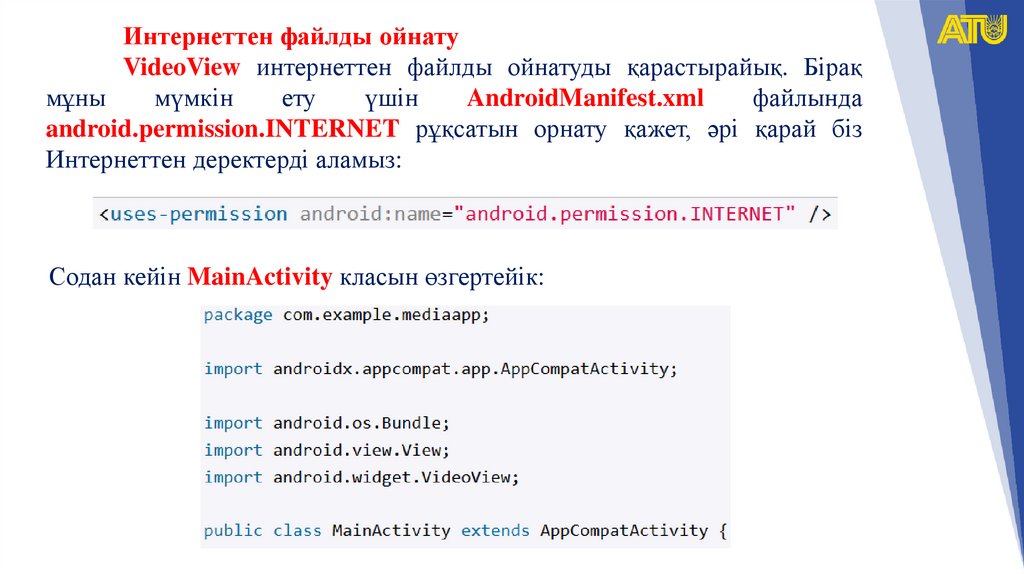 Интернеттен файлды ойнатуVideoView интернеттен файлды ойнатуды қарастырайық. Бірақ