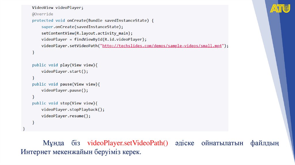 Мұнда біз videoPlayer.setVideoPath() әдіске ойнатылатын файлдыңИнтернет мекенжайын беруіміз керек.