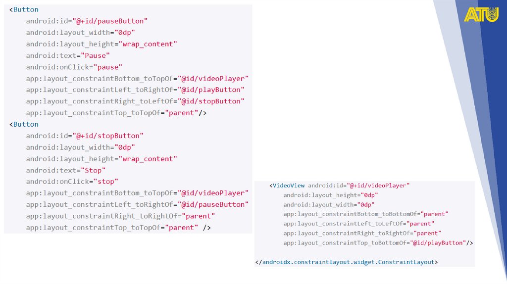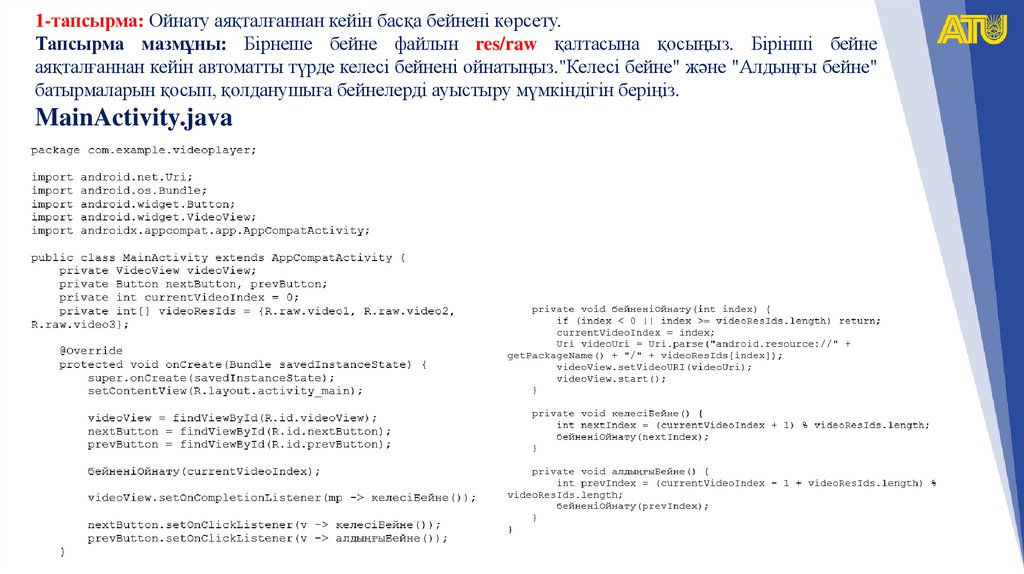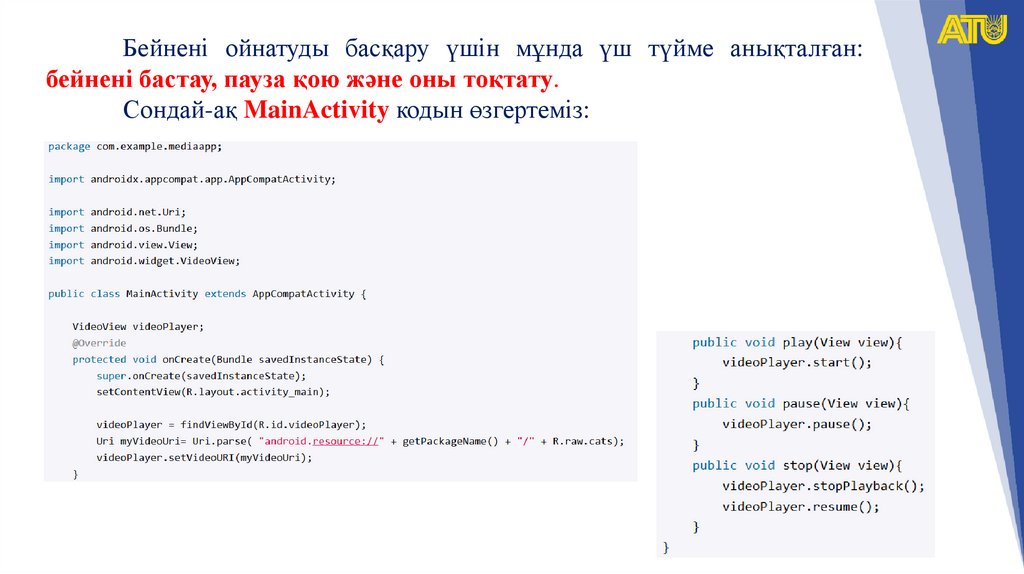Біріншіден, ойнату ағынын басқару үшін VideoView нысанын алу керек:videoPlayer = findViewById(R.id.videoPlayer);