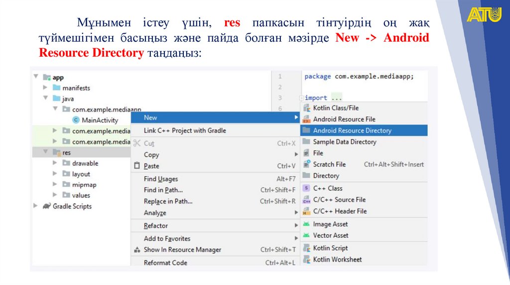 Мұнымен істеу үшін, res папкасын тінтуірдің оң жақтүймешігімен басыңыз және пайда болған мәзірде New -> Android