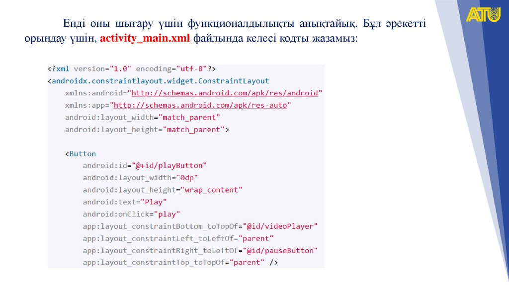 Енді оны шығару үшін функционалдылықты анықтайық. Бұл әрекеттіорындау үшін, activity_main.xml файлында келесі кодты жазамыз: