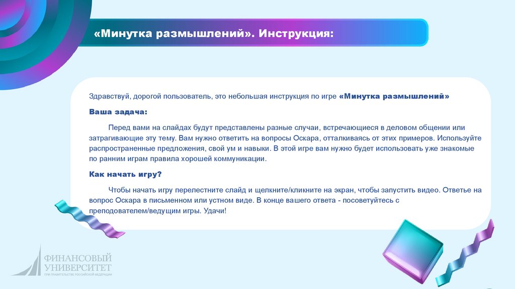 «Минутка размышлений». Инструкция:Здравствуй, дорогой пользователь, это небольшая инструкция по игре «Минутка размышлений»