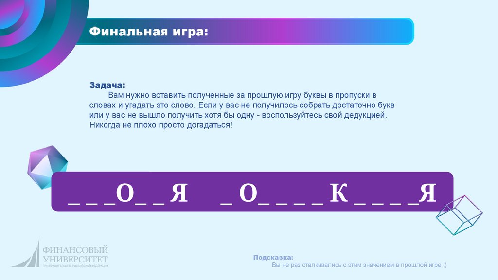 Вам нужно вставить полученные за прошлую игру буквы в пропуски в