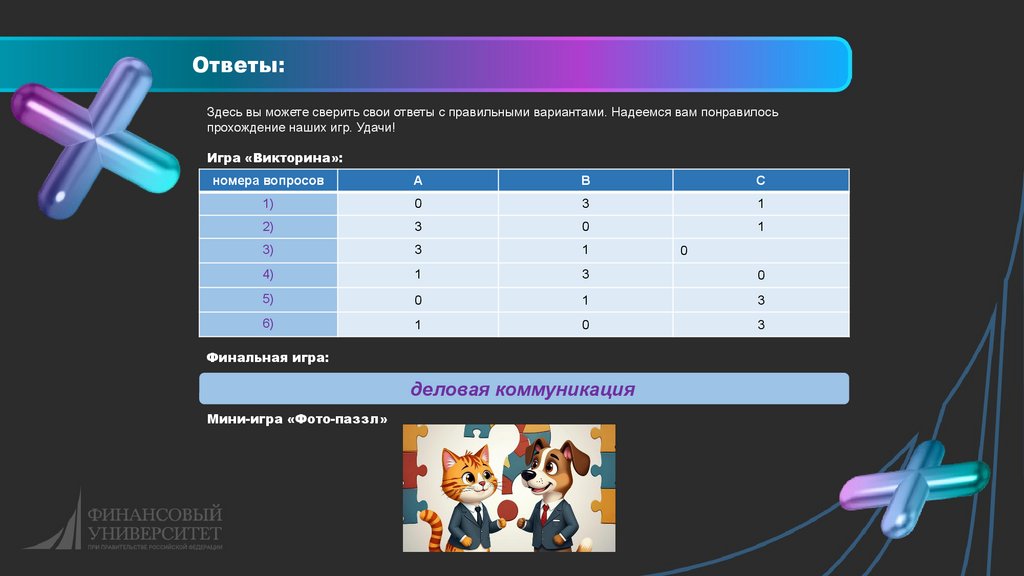 Ответы:Здесь вы можете сверить свои ответы с правильными вариантами. Надеемся вам понравилось