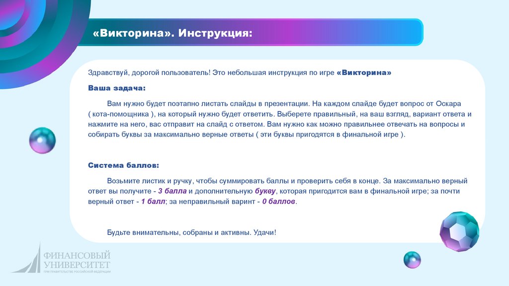 «Викторина». Инструкция:Здравствуй, дорогой пользователь! Это небольшая инструкция по игре «Викторина»